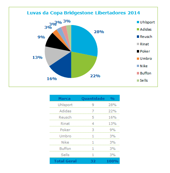 O Guarda-Metas.com apresenta mais um exclusivo estudo sobre a utilização de luvas de goleiros profissionais. Desta vez, apuramos na Copa Bridgestone Libertadores 2014 a marca usada por cada um dos goleiros que entrou em campo na competição. A marca mais usada foi a Uhlsport, presente nas mãos de 9 goleiros, o que representa 28% dos atletas. Logo em seguida apareceu a Adidas com 7 goleiros (22% do total). Veja a lista completa abaixo.